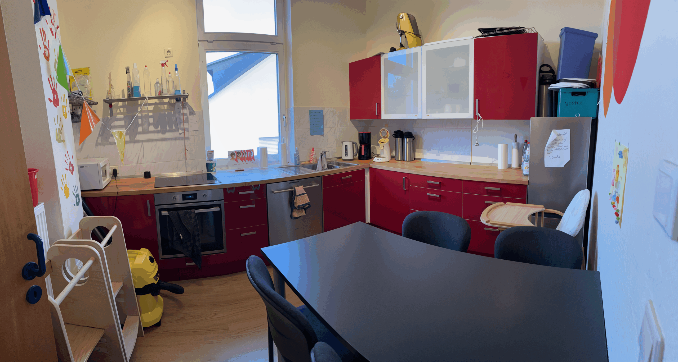 Neben unserer vollausgestatteten Küche mit Mikrowelle, Ofen, Herd, Kaffeemaschinen (Pads und Filter), Kühlschrank mit Gefrierfach, Spülmaschine und natürlich genug Geschirr, Besteck, Becher, Gläser und Co fuer eure Feiern, haben wir selbstverständlich ein kleines Bad mit WC und Wickelkommode. Draußen könnt ihr bei jedem Wetter auf unserem eigenen Spielplatz spielen: Fahrzeuge, riesige Sandfläche, Rutschen, Holzhaus, Wippe, Nestschaukel, Spielzeug und - wenn es warm genug ist - Wasserspaß! Sitzgelegenheiten, Sonnenschutz und ein Grill sind auch da.