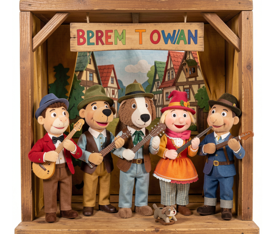 (Beispiel: Bei den Bremer Stadtmusikanten taucht im Puppentheater der Esel auf, später sitzt der Hahn auf seinem Kopf – genau dann, wenn es zur Geschichte passt 🐴🐓)